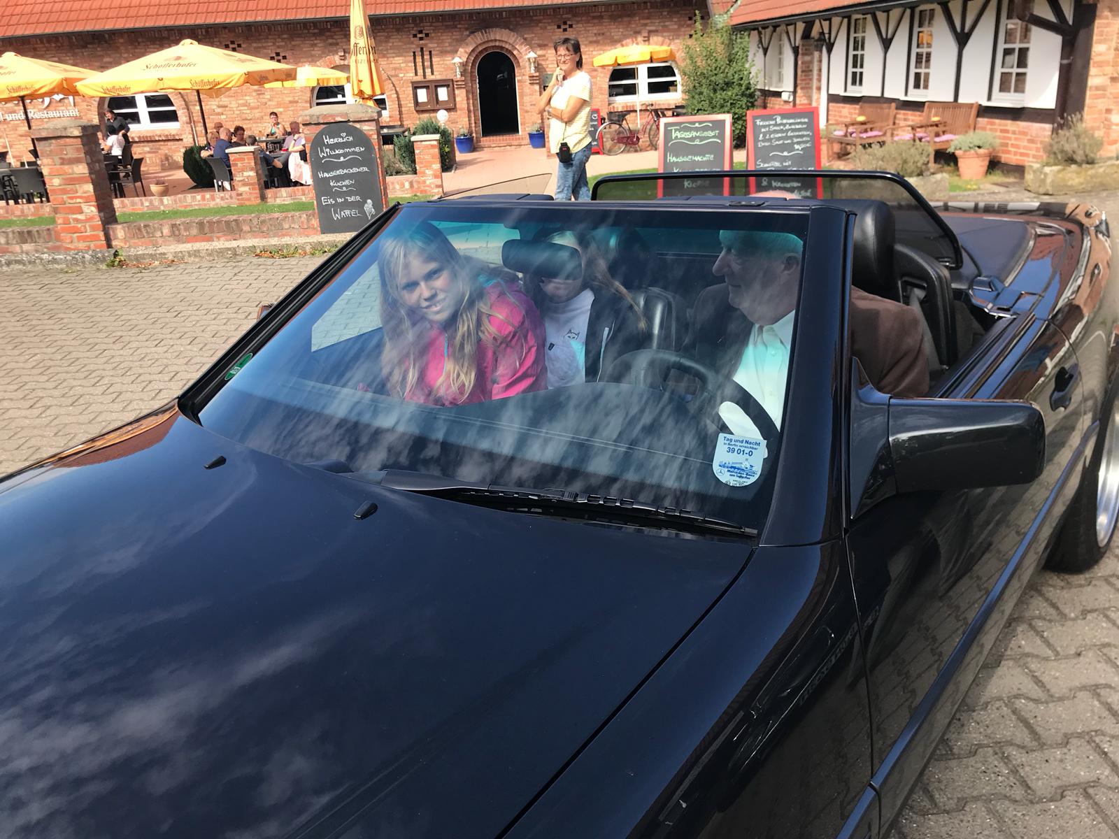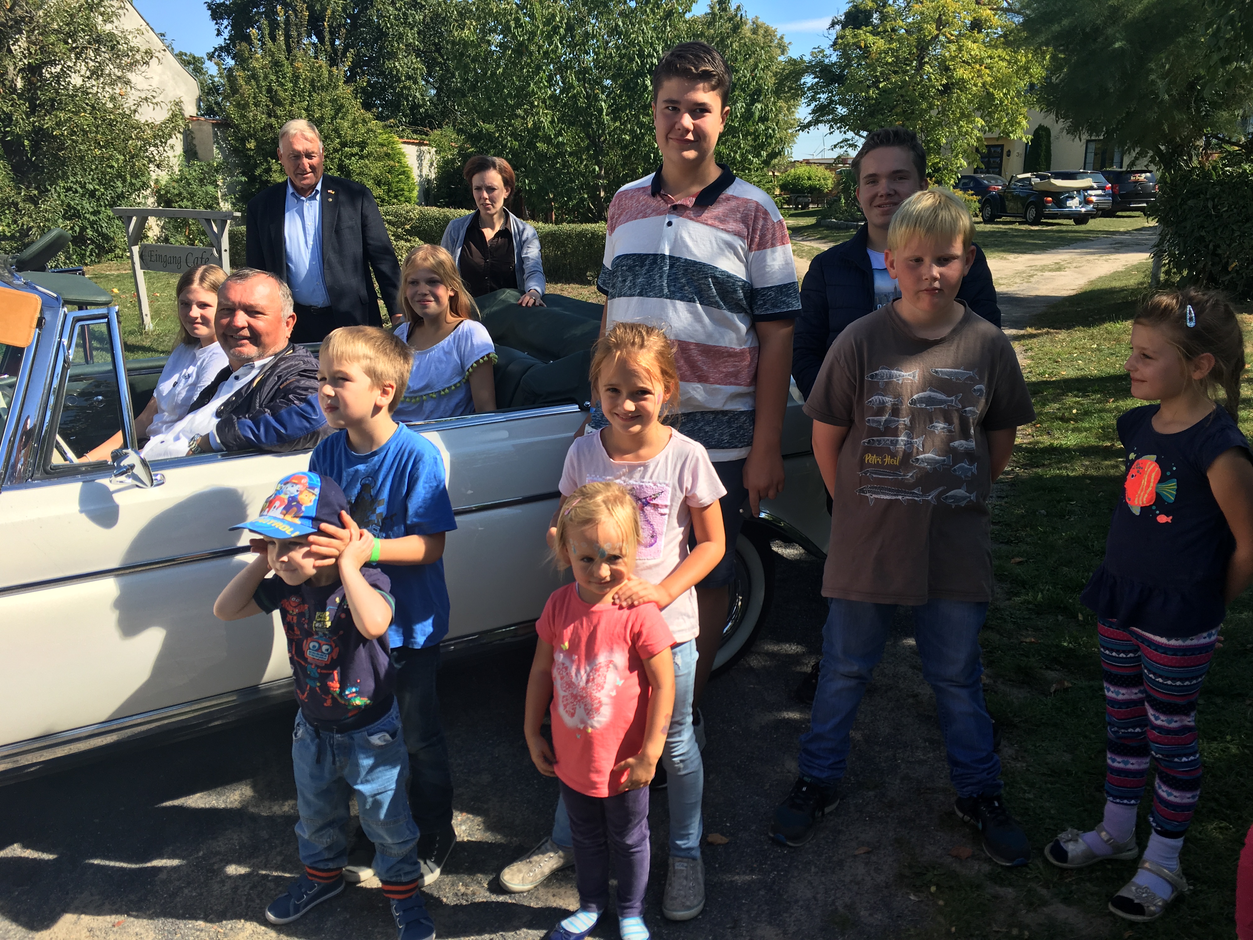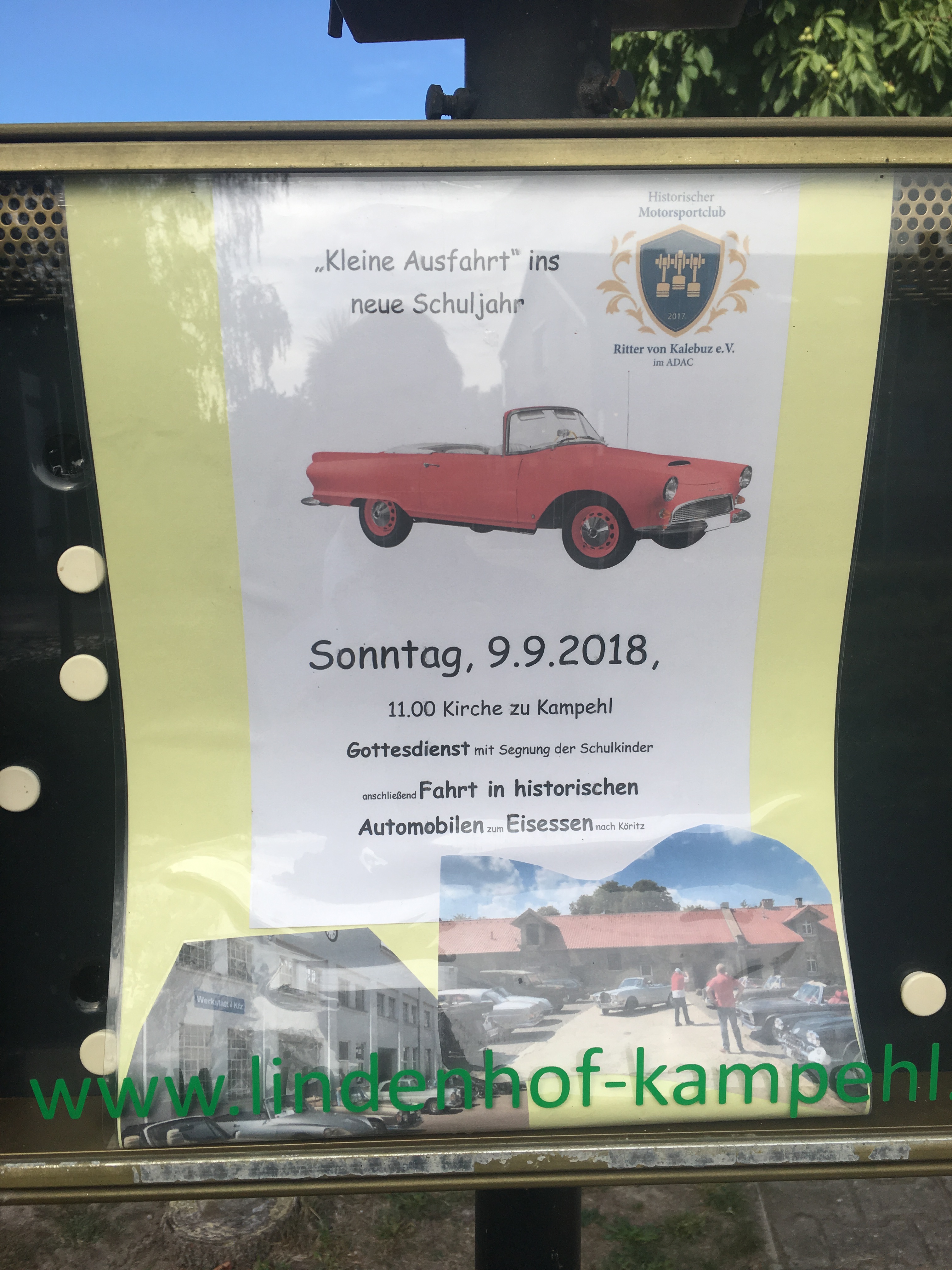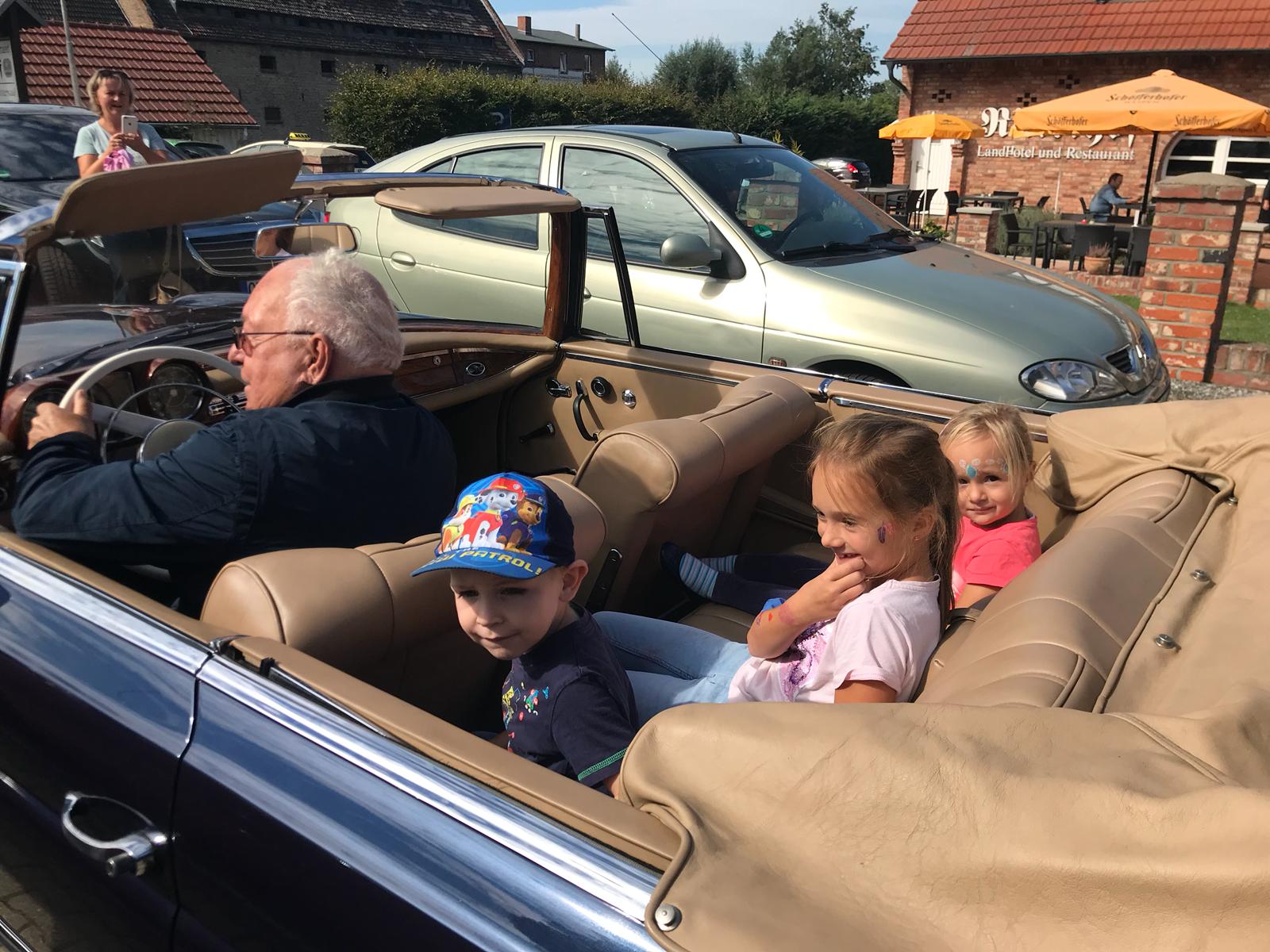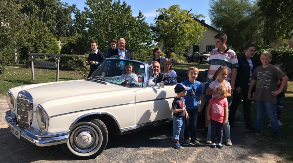 Pfarrerin Annette Graetz hatte zusammen mit den „Kalebuzern“ die Idee zu einer solchen Begegnung entwickelt, insbesondere zur Ausfahrt von Schulkindern in den klassischen Autos zum Eisessen. Die Schülerinnen und Schüler genossen sichtbar die Strecke zum Eis-Salon in Neustadt, der extra früher geöffnet hatte. Sie schätzten besonders die offenen Mercedes 220 SE und 300 SE aus den 60er Jahren ebenso wie das Rolls Royce Cabrio, den Ford Thunderbird, einen Mercedes 500 SL, den knallroten Porsche 911 SC, den VW Käfer 1302 Cabrio oder die 190er-Mercedes Heckflosse. Es war eine herzliche Begegnung auch mit den Eltern der Schulkinder, die zum Teil auch in den Autos mitfuhren oder vom Straßenrand zuwinkten.